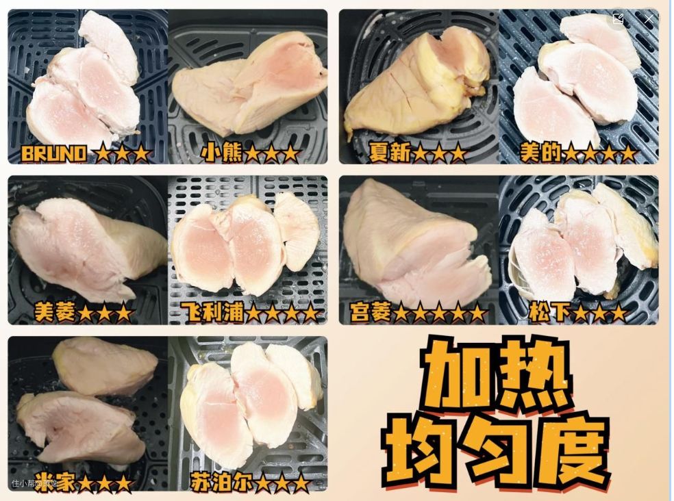 测评过程:我在空气炸锅内放入体积重量一致的生鸡胸肉,预设180℃进行7分钟的烘烤,然后把鸡胸肉从中间切开,对比由内到外的生熟均匀程度。