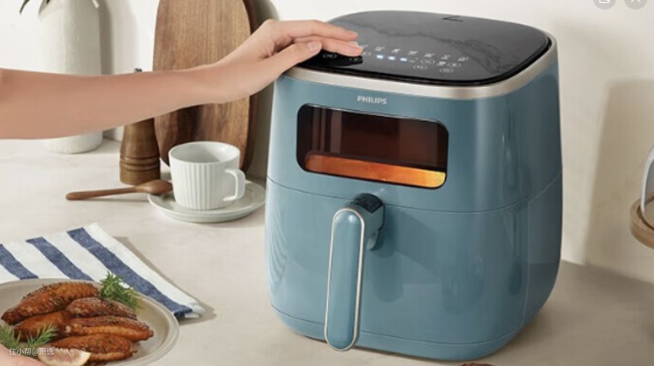 ①飞利浦的空气炸锅品类很多,这款是官方最新推出的型号。空气炸锅的外观非常好看,配色可以选择少见的复古蓝,可视窗口也经过了45度斜角的人体工学设计,方便随时观察食物的状态。使用时噪音还是蛮大的,不太方便,初次使用也有比较大的异味。