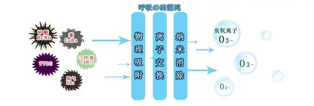 硅藻纯的净化原理主要是靠物理吸附+离子交换+纳米消除,把甲醛、苯、TVOC等变成负氧离子和二氧化碳。