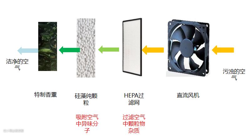 直流风机用强劲的风力将异味分子运送到HEPA过滤网,HEPA过滤网先拦截空气中的微尘、烟雾等污染物,过滤空气中颗粒物杂质。