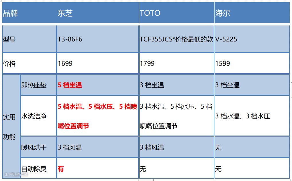 有了这么多功能,你猜它会不会很贵呢,NO,作为一个精打细算的人,在入手之前我还对比了同价位的大量智能马桶盖产品,比如TOTO TCF355JCS、海尔V-5225等,做了一张表格供大家对比。