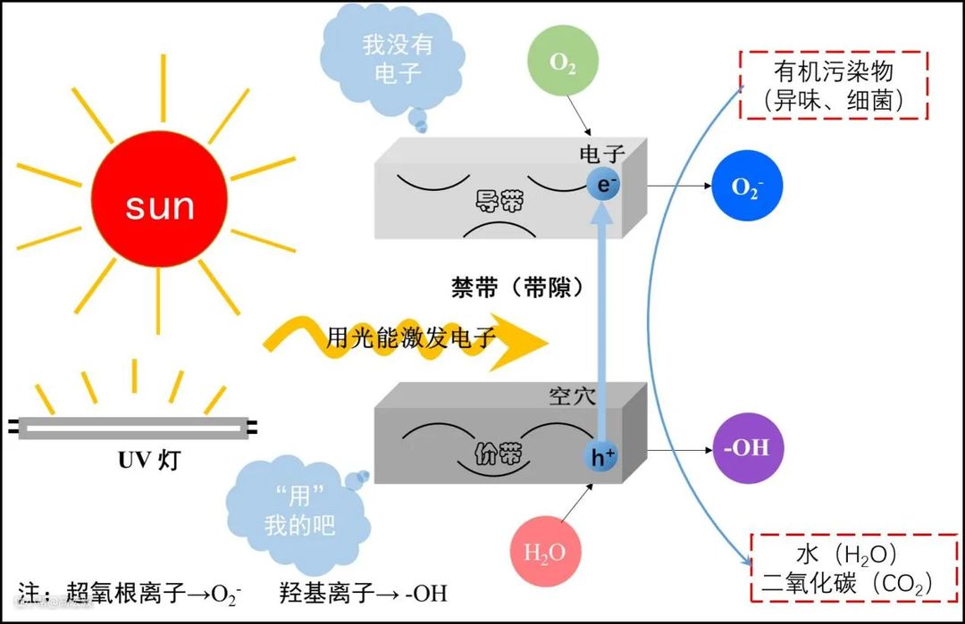 光触媒技术又被称为光催化剂,光触媒技术能够针对有机污染物进行有效消除,原理是光触媒在光的照射下,生成自由基,将有机物分解为二氧化碳与水,破坏细菌和病毒的生存环境,从而杀死细菌、病毒,总之就是将光能转化为了化学能。缺点是光触媒技术容易造成二次污染,而且在饱和之后还需要定期更换,成本较高。