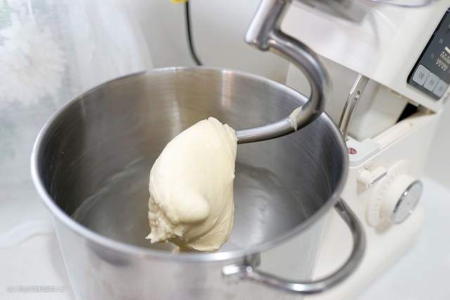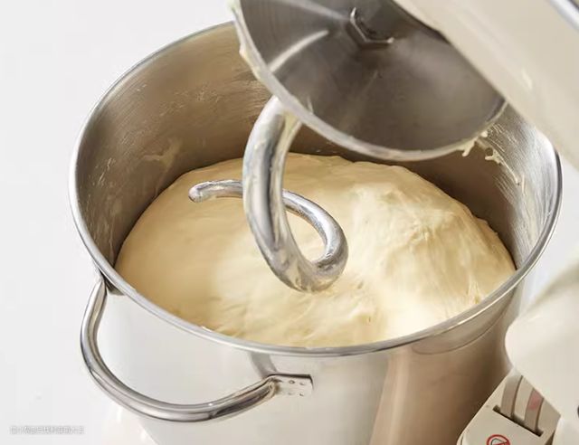 ►面粉+牛奶+鸡蛋+糖,选择厨师机揉面模式2档,搅打2分钟至无干粉面团。