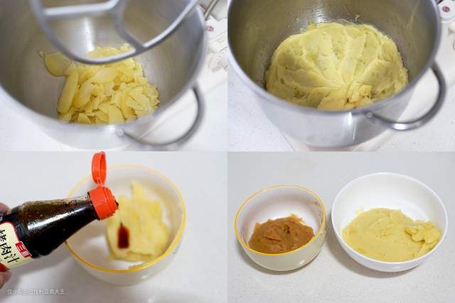►拿出四分之一的土豆泥,倒入烤肉汁调味调色,然后分别装入裱花袋中。