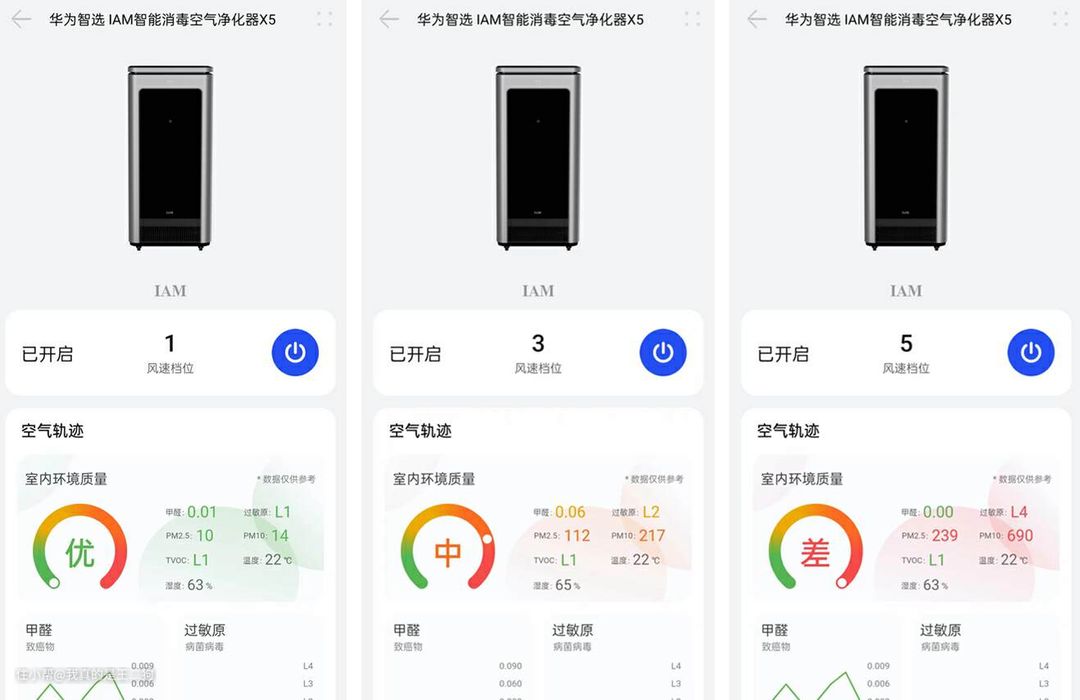 各类物质燃烧后都会产生烟雾,这些烟雾中含有大量硫氧化物、烷烃、醛类、细微颗粒物、异味气体等有害物资。通过开启华为智选IAM X5进行室内净化,可以有效检验机器的甲醛、PM2.5、PM10和TVOC的净化能力。二狗使用华为智选IAM X5自带的检测系统进行数据测试,测试场景为20平左右密闭的房间,观察屏幕参数变化。初始状态空气质量为差,甲醛无读数(才开机状态下无法正常测量甲醛),PM2.5为198,PM10为425,过敏原等级为L3,TVOC等级无读数(才开机状态下无法正常测量TVOC)。经过18分钟后,空气质量为优,甲醛为0.02,PM2.5为29,PM10为37,过敏原等级为L1,TVOC等级为L1。从实测数据可以看出,华为智选IAM X5可以支持多种有害物质的净化,整体的净化效率也是比较高的,并不算小的房间在18分钟内就从空气质量很差的状态恢复到优秀的状态。简单来说就是,一台华为智选IAM X5就可以快速搞定房间的各种空气净化工作。