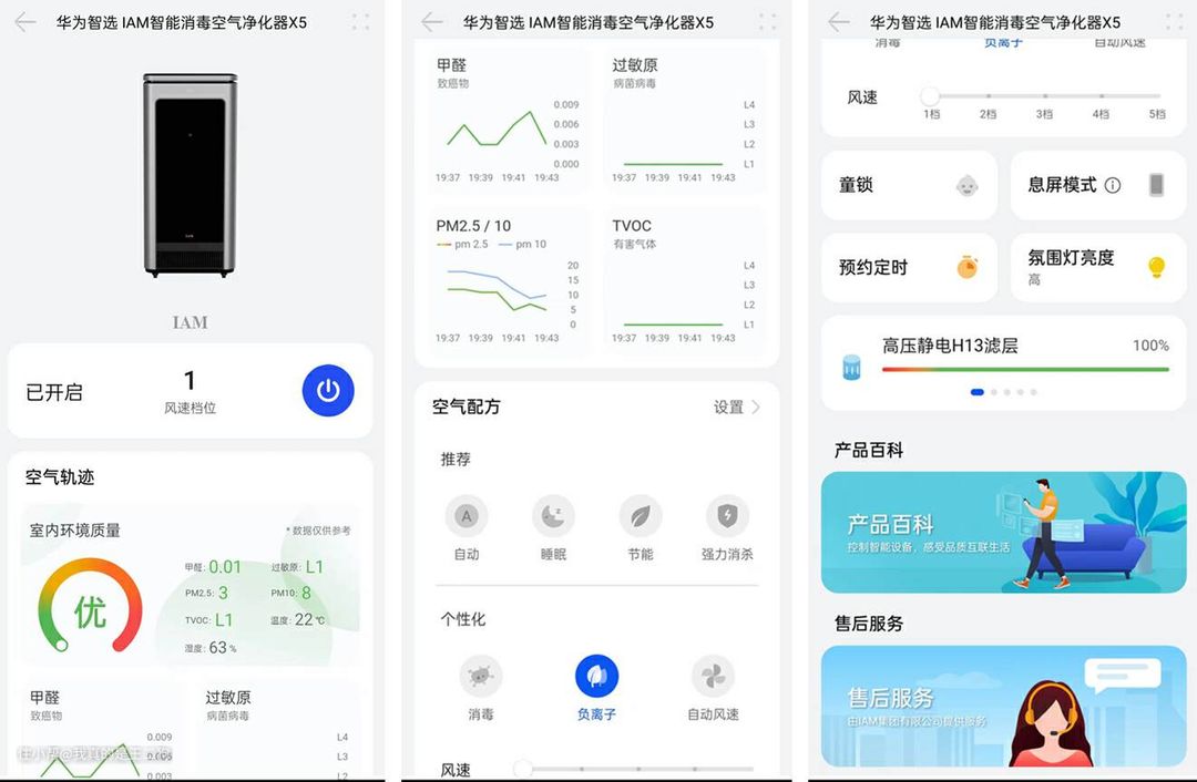 这里再介绍下华为智选IAM X5的六重净化,也就是支持初效滤网、高能集尘消杀电场、强化醛解滤层、净味除醛炭魔方、高压静电H13滤层和负离子净化矩阵组成的多重净化。