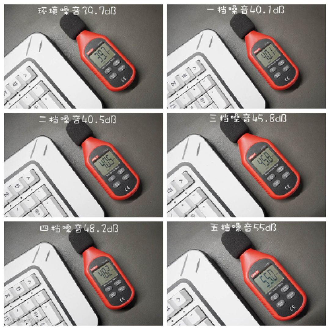 由于空气净化器产品需要连续工作,噪音控制的好坏直接决定了使用体验。二狗选择在不同档位距离机器本体一米外的位置分别记录噪音表现。在环境噪音为39.7dB的环境下,测得最高噪音为55dB,最低噪音为4.1dB。这个测试表现还是很不错的,一二档次开启基本没有噪音, 三四档位模式下工作基本只比环境噪音稍高,五档的噪音表现比较明显。总的来说,噪音控制较为理想,合理选择档位空气净化器的使用不会影响日常休息。