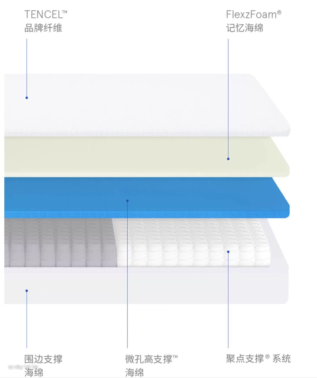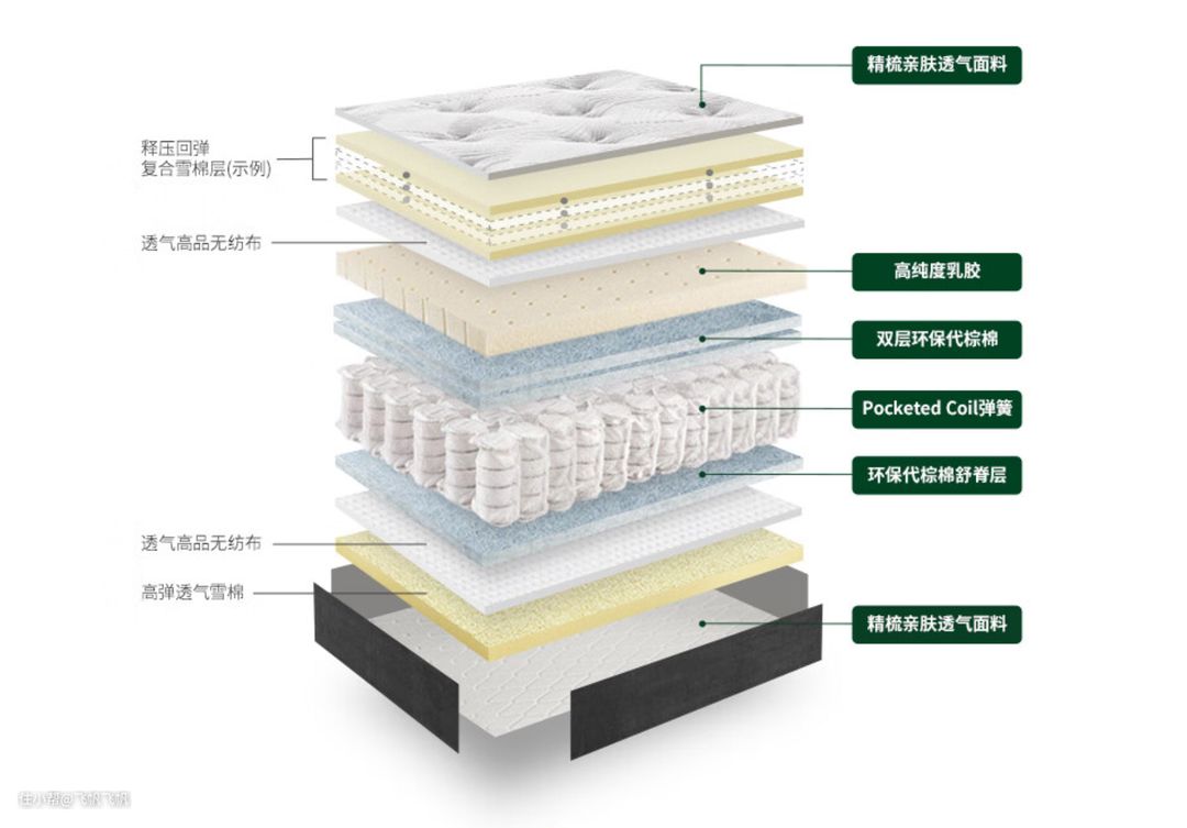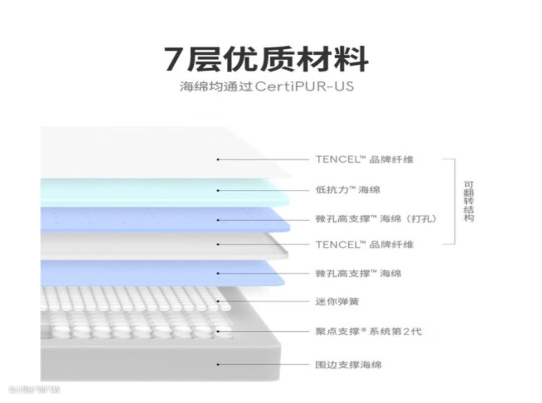 比如用料上,依旧没有采用“高端、纳米、天然”等溢价用的材料,只是增加了一层可以两面调节睡感的、独立的舒适层+一层超小的mini弹簧,用来增加睡感的细腻度。但整体睡感还是保留了Z1的大方向。