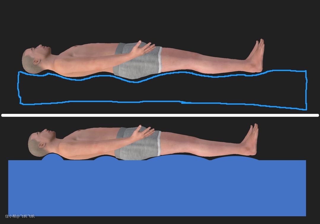 这就涉及到每个人在躺下时,身体自然曲度所需要的支撑力大小区别了。有一个发现是,相较于支撑过度,支撑不够带来的不舒服感会不那么明显,甚至刚开始会有舒适感,长期下来反而会难受。比如塌陷式的沙发,过度下陷的酒店大床。