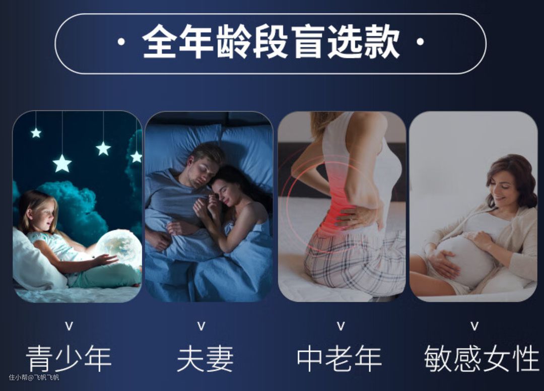 从全年龄段适应的宣传来说,这款床垫应该是略微偏硬、支撑都适中的床垫,不然就不会写中老年与青少年上去了。