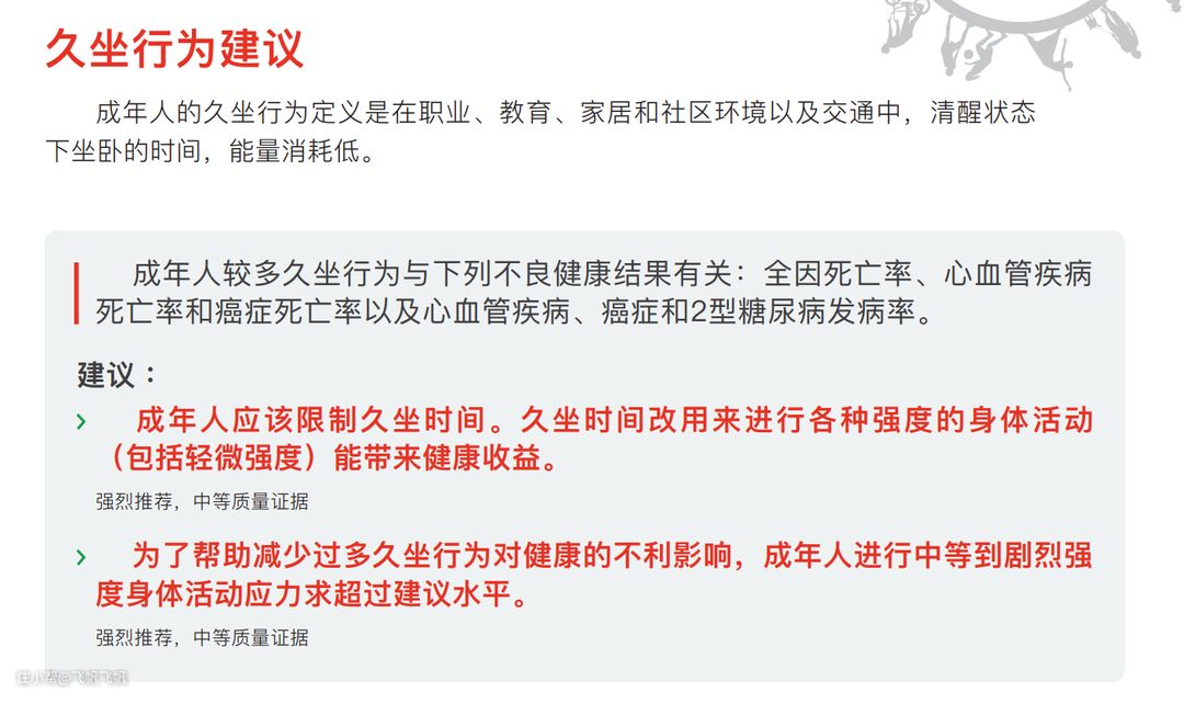 而实际上,这应该是21年世卫组织发布的《世卫组织关于身体活动和久坐行为的指南》中,针对成年人久坐行为建议里面提到的内容,具体如下。