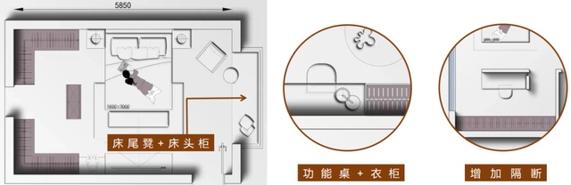 “黄金组合”+“床头+隔断”+“功能区”不靠墙式布局。