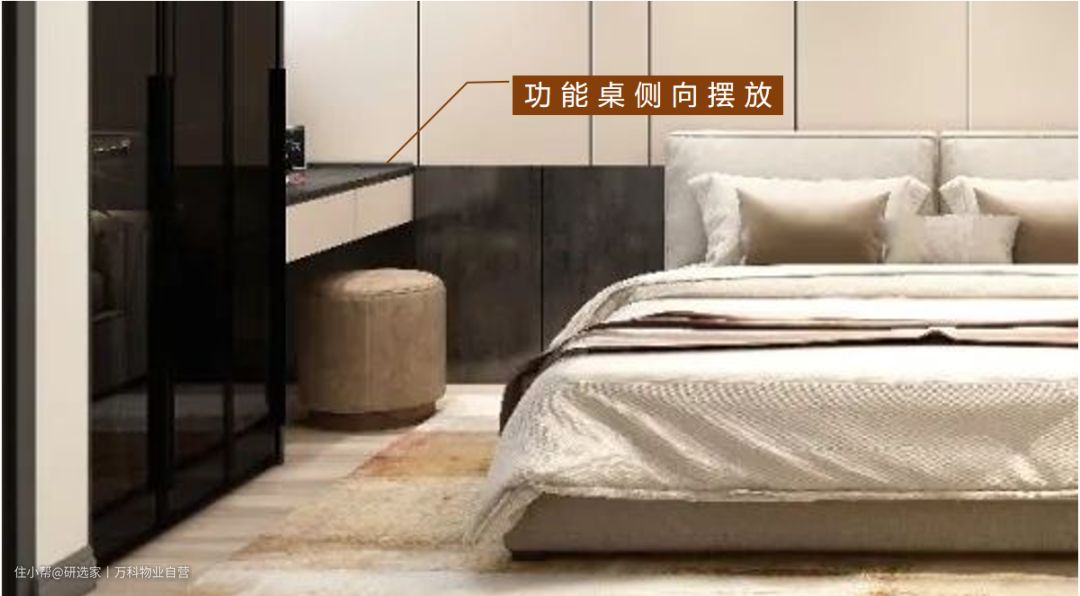 二)靠衣柜一侧床头柜调整为化妆台,与衣柜进行一体式设计,丰富空间。