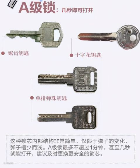 ⑴A级锁芯:钥匙为平板式或月牙式,单侧或双面有一排凹形的匙槽或四面有凸形匙槽。这种设计相对简单,安全性较低。小偷仅需一分钟的时间就能轻松打开这种锁。