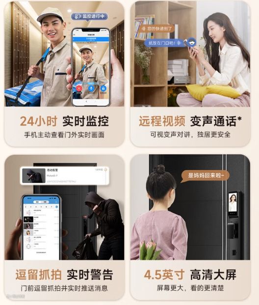 推荐理由:内置了HarmonyOS可视猫眼,搭配智慧屏,为用户提供实时门外情况的便捷观察。不仅如此,这款产品操作方式极为灵活,不仅支持按键式操作,还可选择感应控制,满足用户个性化需求。它集成了可视猫眼和高清猫眼两种功能,用户只需在室内的显示屏上,便可随时了解门外状况,确保家庭安全。