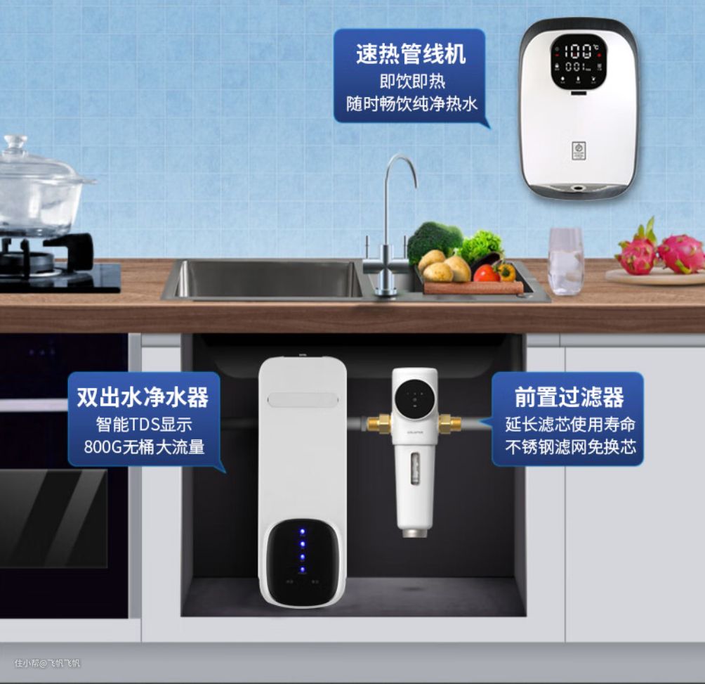 前置净水器给全屋用水进行一次粗过滤,末端净水机解决了厨房用水、饮用水的净化需求,是最基础的方案。