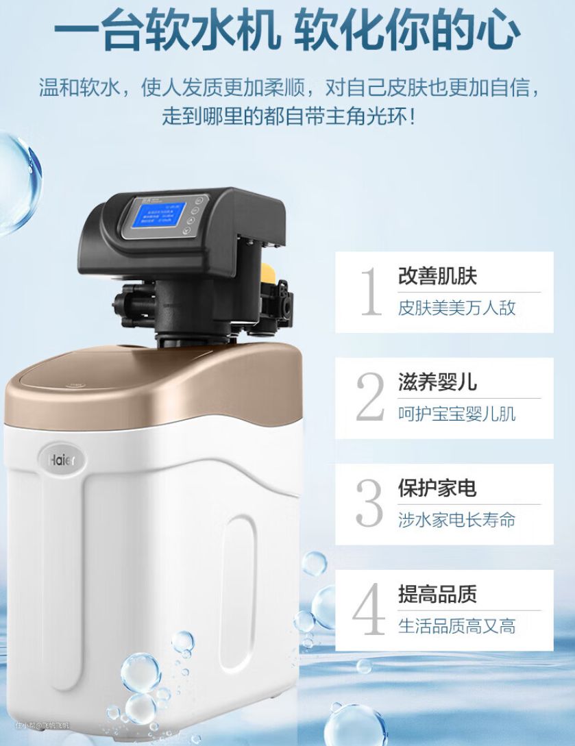 安装在前置或者中央净水器之后,主要用于去除水中的钙镁离子,降低水的硬度,软化水质,防止结垢造成管路阻塞和设备损坏,提供更舒适柔润的生活用水,比如洗浴、美容等。