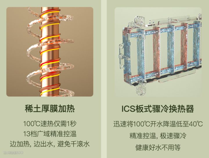 加热部分使用新一代IRTEF稀土厚膜技术,1秒即可将水烧开至沸腾;冷却部分使用ICS板式速冷模块,2秒钟实现热交换,让开水骤冷。