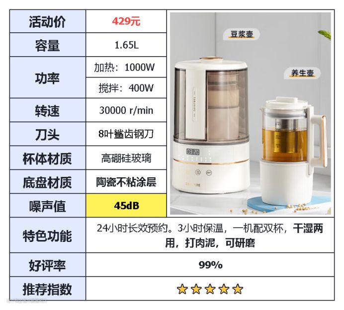 宜盾普这款破壁机我感觉是实现了大家对破壁机所有的幻想,官方说可以打肉泥,可以研磨,但是嘞,我担心会串味,还是不太建议用同一个杯体做这么多用途,打豆浆又磨干辣椒的话,这样估计会留下些味道。选配的养生壶感觉还不错,专杯专用,噪声值45分贝,不担心吵到邻居。24小时长效预约,是我研究的这几款里面预约时间最长的,提前一天就可以预约了,建议夏天不要预约这么久,免得太热食物发臭。