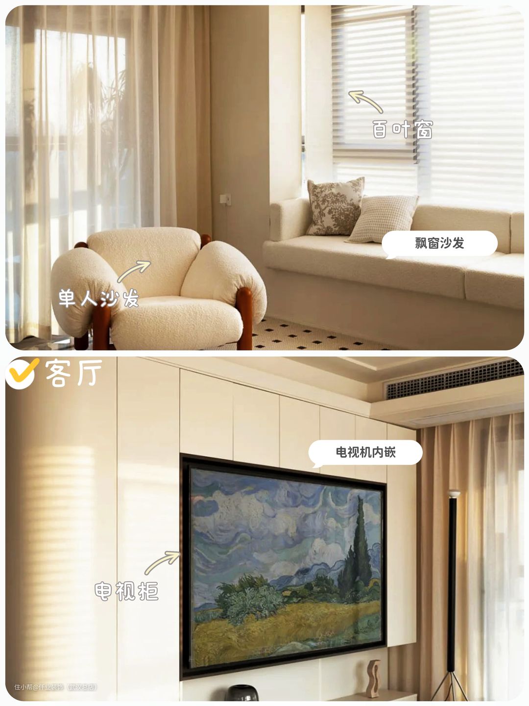 🍑🍑起居室和餐厅是一个宽敞明亮的横厅,整个房间被乳白色所包裹,散发着温婉的气质。