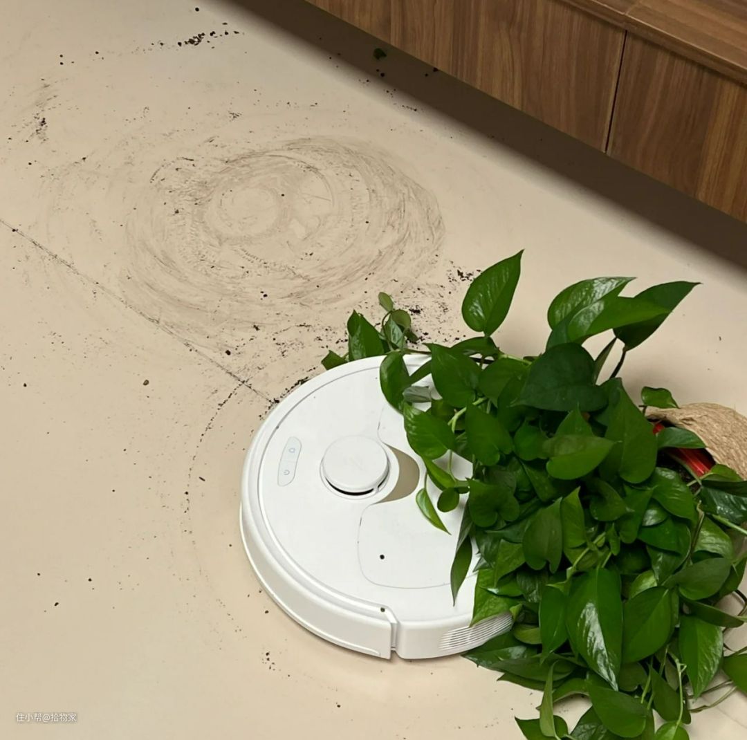 网友@小红薯5EE40CCC的家,开机第二天就把花盆砸了。事情是这样的,绿萝的枝条长到了地上,扫地机器人不会避让,清扫的时候把花盆扯了掉下来。