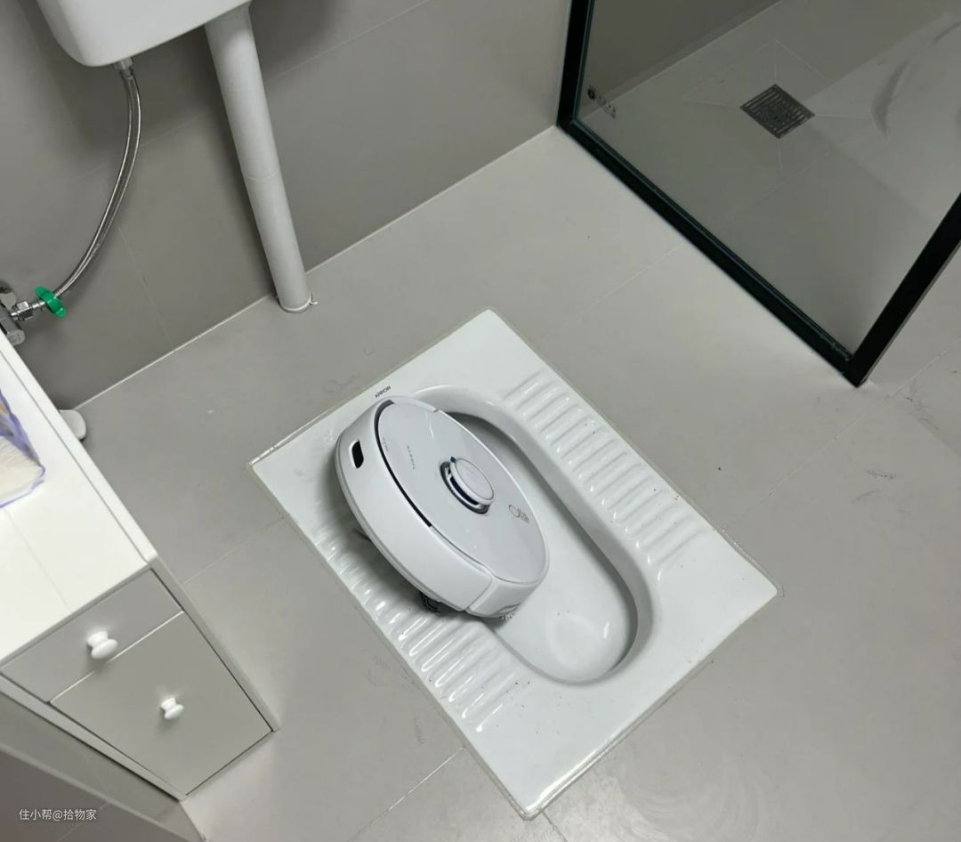 网友@不恬的家,真不是屋主故意把它扔到厕所里面的,怪它不会避坑,所以就上演了这一幕。