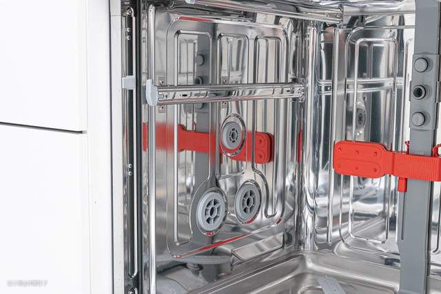 以往所有的锅、盆放入洗碗机时,都需要倒扣才能清洁干净,而大尺寸的炒锅、火锅倒扣后非常占地方,如下倒扣后底部碗篮就不能放什么东西了,而竖起来侧扣常规的洗碗机会清洁不到。而增设了一组后置喷淋臂后,就可以专门用来清洗侧扣的大锅了,提升清洁效果的同时,有效节省空间。但同时对洗碗机的水压提出了更高的要求,因为出水的位置变多了,水压小清洁力就会减弱,这款的水压达到45000pa,比一般机型35000-40000Pa的最大水压要更大,清洁力有保障。