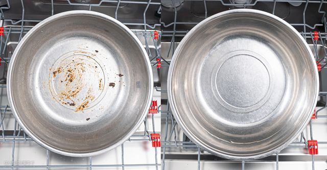 由于采用了720°的立体喷淋系统,加上背部增强喷淋,双驱BLDC变频电机带来45000pa的大水压,以及智能水质调节系统,三重精滤系统带来的5大超强清洗系统,清洁效果真的非常惊艳,如下是清洁 前后的对比图,不管是油污、咖啡渍、烧灼的痕迹,在使用了3小时的智能洗,配合上自动投放系统投放的亮碟洗碗液后,都清洁干净了。