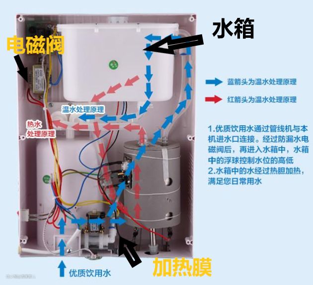 本质就是个很简单的装置,就是净水进入水箱,加热后通过内部的另一端出水。