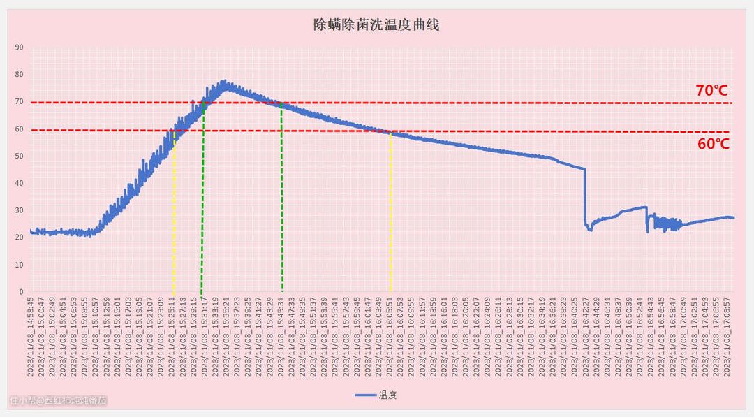 可以看到在「除螨除菌」模式下,当温度升到最高点之后不会马上回落,而是会在较高温度区间内维持一段时间 ▲