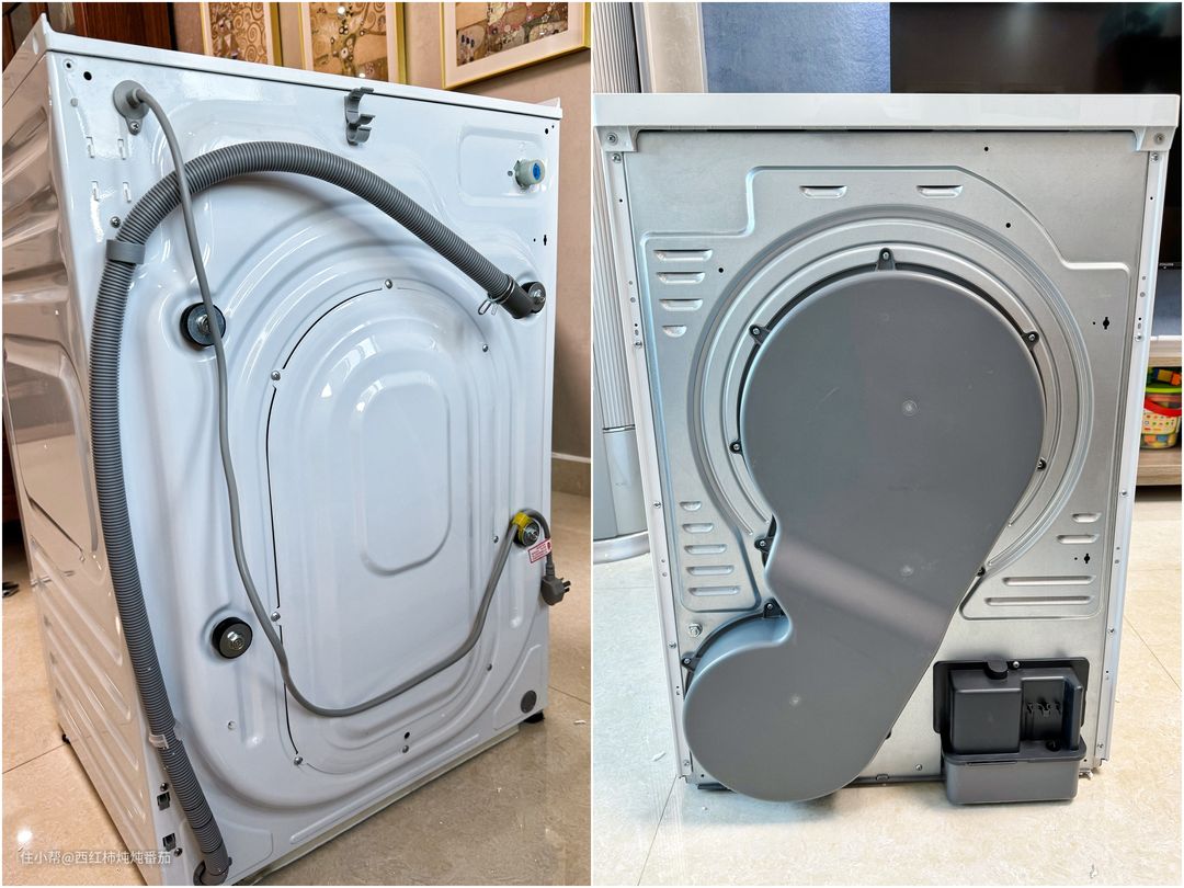 乍看机器背面,仅有洗衣机拥有一条常规尺寸的排水管,而干衣机背面空空如也 ▲