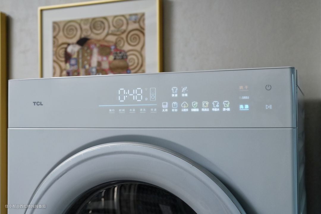 这套TCL双子舱T10在高度集成了水电的同时,也高度集成了控制面板,洗、烘、护三大功能的控制都通过位于干衣机顶部的这块面板实现 ▲