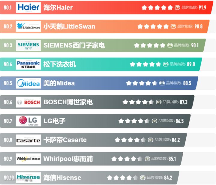 洗衣机作为大家电肯定是选择一线品牌了,建议选择海尔、小天鹅、美的这三个国内品牌,喜欢外资品牌的话可以选择西门子、博世、松下等品牌;