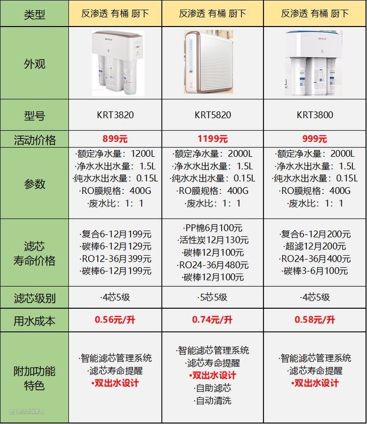 KRT3820和KRT3800差不多,只是3800在20的基础上升级了过滤系统,改变成了超滤+RO的模式,这样的双出水设计才更出色,价格也没贵多少,家里如果有地方安装无桶的还是可以考虑3800的。(不能自主换芯,这个有点麻烦)
