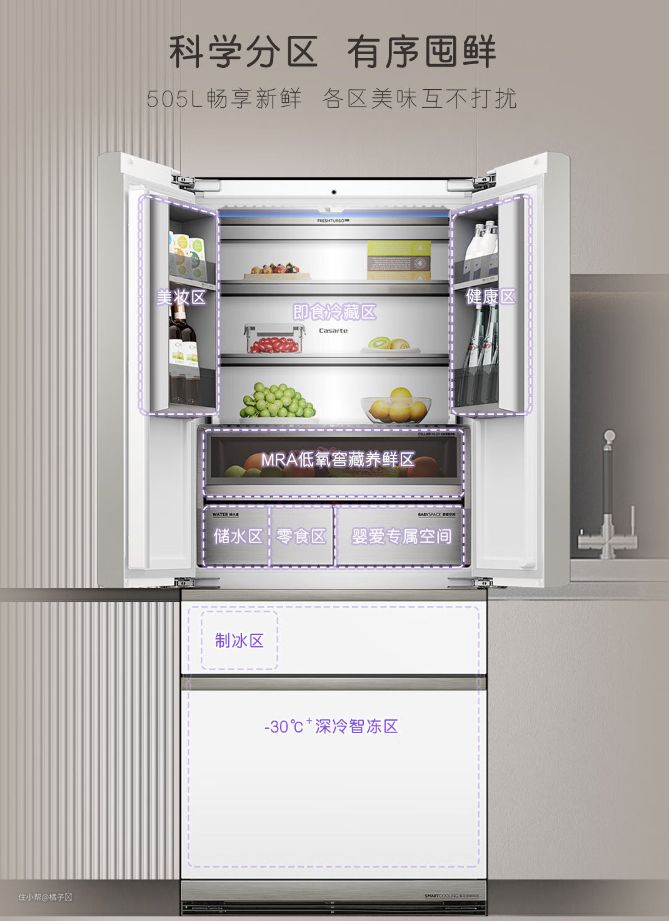- 独立母婴专属空间,珍品、母婴、冰镇、零度保鲜四种模式,满足母婴不同阶段储鲜需求;