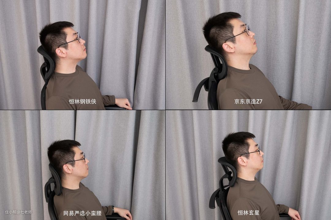 实际使用中恒林钢铁侠、恒林玄星、网易严选小蛮腰的颈枕很容易调节到比较舒服的位置,京东京造Z7因为角度调节小,很难调整到比较舒服的位置。