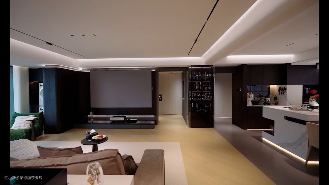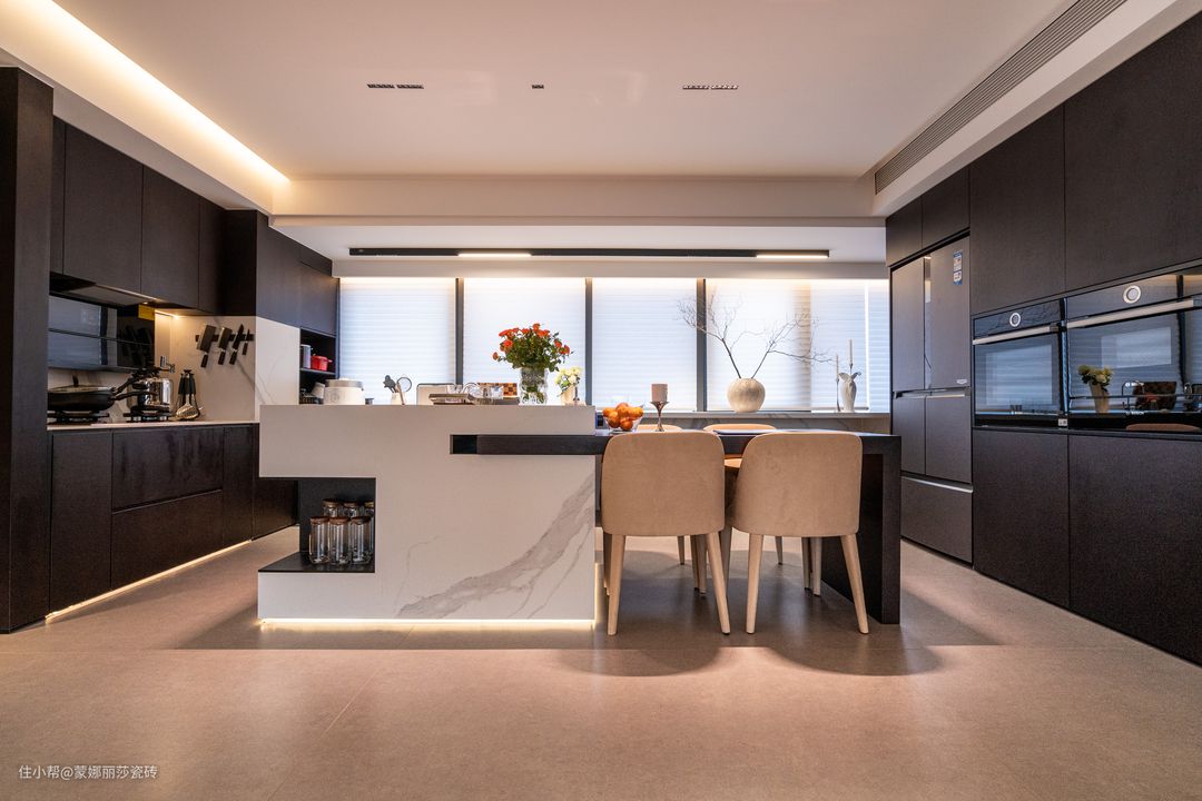屋主有杯美式的家是意式极简风,客厅选择的是木地板,而餐厨区域考虑到实用性问题选择的是铺灰色陶瓷大板,灰色的陶瓷大板与木地板拼接,将家里的区域进行了一个功能性划分,与家里的黑灰色软装也搭配得当,同时还方便了日常的厨房打理与清洁。