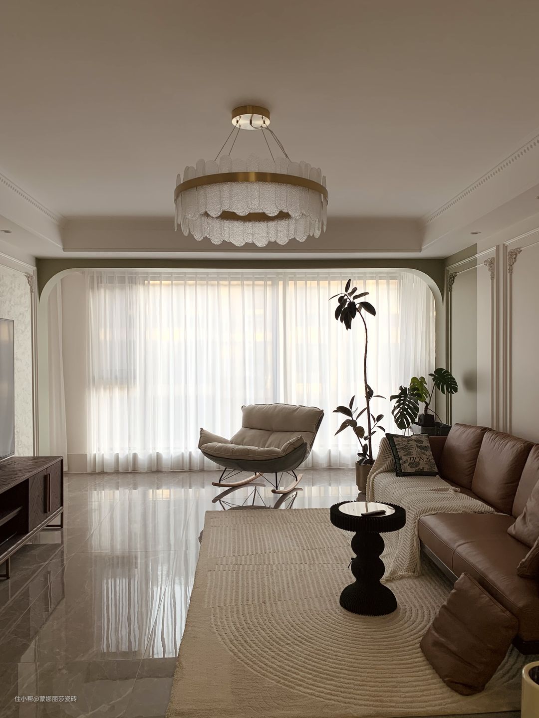 不要认复古风用陶瓷大板容易产生违和感,灰色陶瓷大板也能打造法式复古风。案例中的屋主甜甜的宝藏选择在客餐厅通铺伊朗灰陶瓷大板,米白的丝线错落分布在浅灰色的砖面上,自然而不突兀,搭配法式水晶灯和复古咖色的沙发以及餐桌,法式复古风也能轻松拿捏。