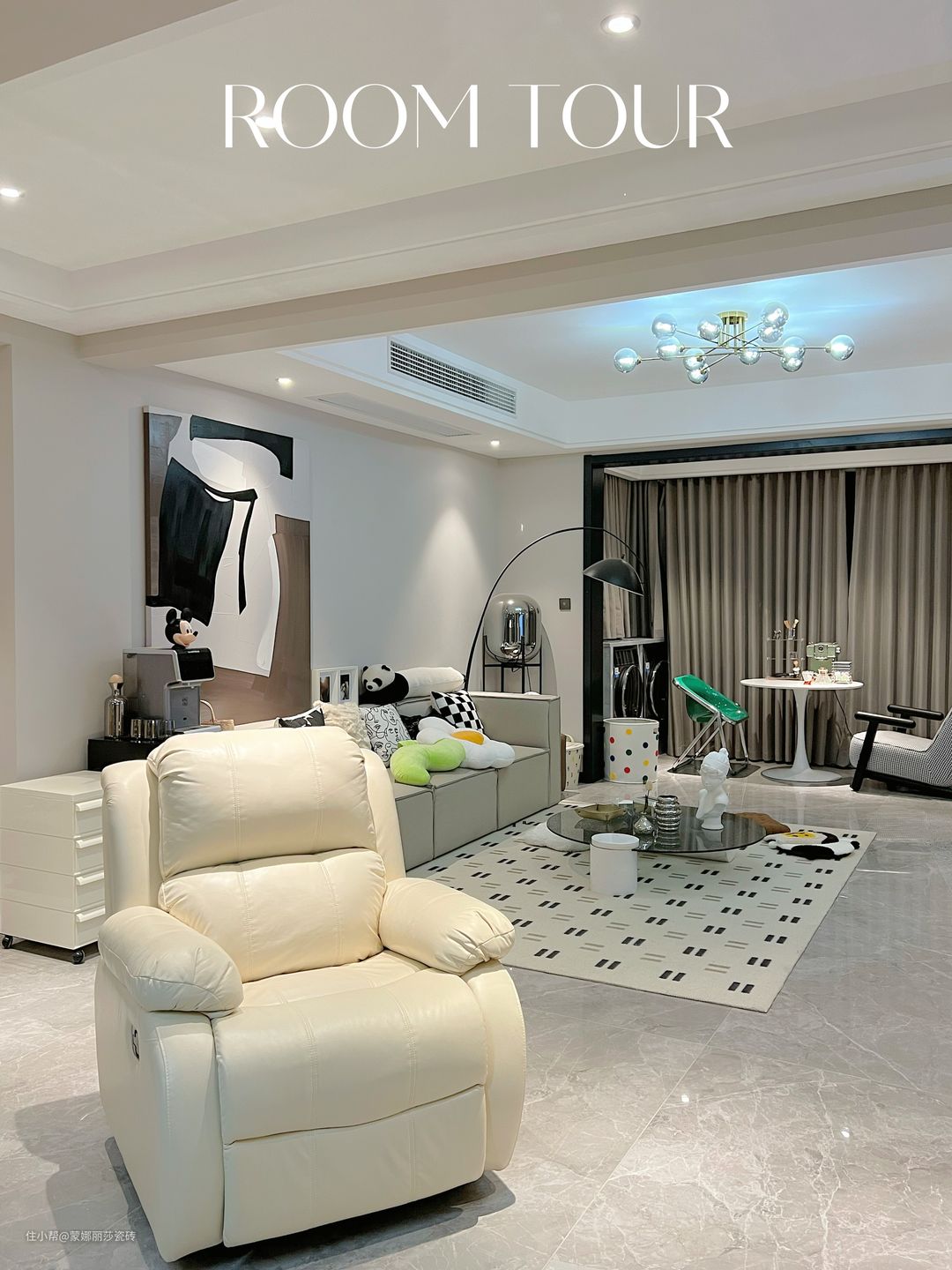 屋主-可爱不动了的客厅选择通铺银鼎灰陶瓷大板,表面带有晶莹亮丽的光泽感,行云流水般的纹理分布在地面上,奠定了客厅温柔、温馨的格调走向,再搭配低饱和度的米白色的沙发和地毯、纯色的奶咖窗帘、莫兰迪色系的抽象挂画,奶油风的气息油然而生。灰色的陶瓷大板+奶油色的软装打造现代奶油风的客厅,简约大气又浪漫温馨。