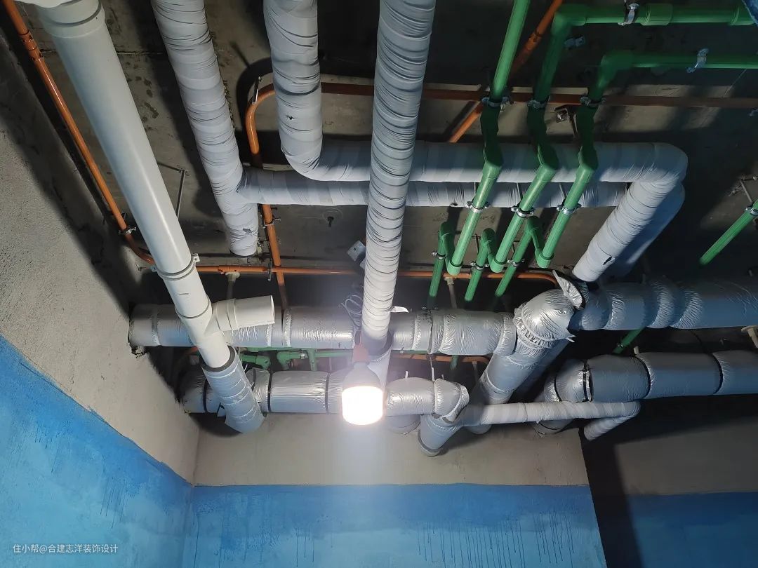 卫生间顶部走管乱中有序,于细节处见功夫。水管和电管都是走顶——绿色是水管,红色是电管,电走上,水走下。下面最粗的是下水管,它被进行了结实的包裹,并且每隔20-30cm都会做固定,达到隔音效果。