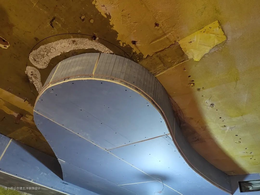 此处的弧形吊顶(图中选用了黄金龙骨)是根据全案设计师的施工图纸制作完成,它是又一例合建装饰两全模式下,设计与施工完美配合,满足业主个性化的细节。全案设计师在前期了解到业主的需求,为了配合业主家的一台钢琴做了这一设计,在施工阶段,它在现实中完美落地。