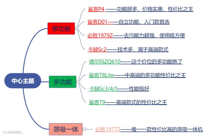 基础入门款的性价比之王:鲨客D01(单功能)、德尔玛ZQ610(多功能) 中低端的性价比高的,价位千元内:鲨客P4、必胜1979Z(单功能)、鲨客T8 Lite 高端性价比:卡赫SC2(单功能)、卡赫SC3/4/5、鲨客T9