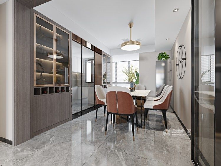 根据动线流畅上的考量,餐厅与客厅在同一空间,定制的餐厅柜与天然石材纹肌理感的饭桌,整体感与环境完全相融,一切都呈现出与自然的和谐平衡。