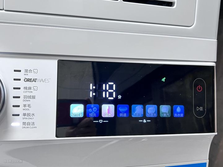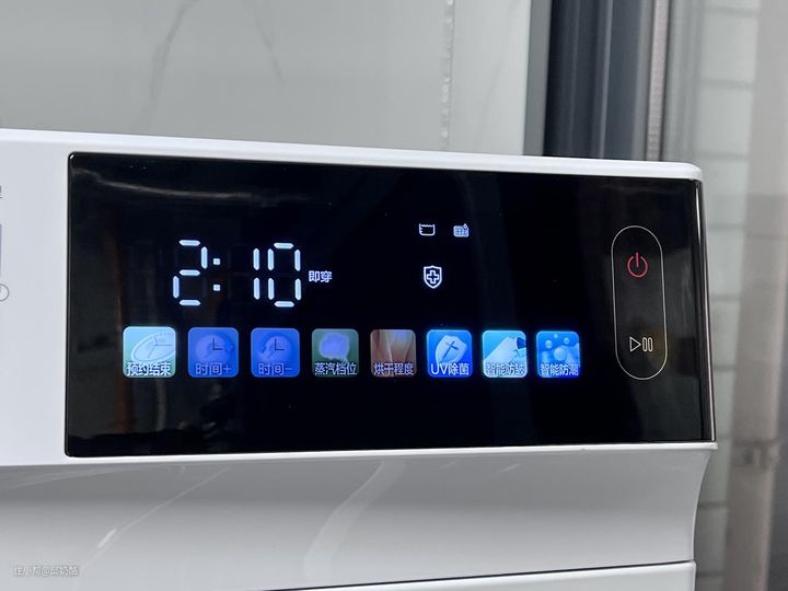 最右侧是开机键和启动/暂停键位,简单和大家展示一下,可以看到旋钮采用非常丝滑,衣服放进去找到对应的模式点启动就ok了,没有学习成本,家里的老人和孩子都能直接上手。