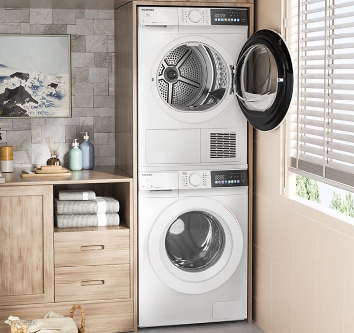 第二点是空间,因为多数家庭为小户型,洗烘套装堆叠式摆放真的很省空间,东芝玉兔洗烘套装纤薄的机身还没有我家冰箱占地方。新房装修常规600mm橱柜东芝玉兔洗烘套装都能完美嵌入,也可以在有水电的位置直接摆放,同样美观方便。