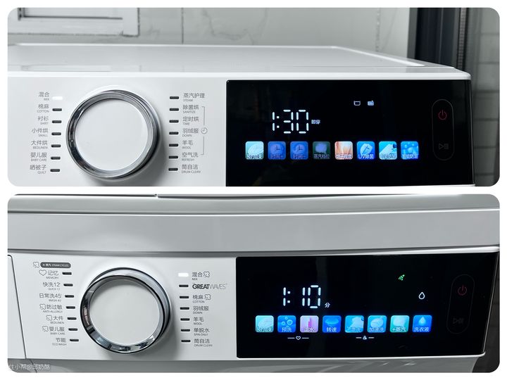 洗衣机和烘干机外形设计比较相似,都是中间旋钮右侧显示屏的设计,旋钮左右是对应的多种功能,洗衣和烘干功能都很丰富。
