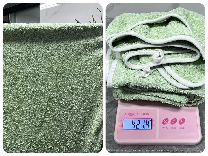 烘干完毕后可以看到浴巾表面的绒毛非常松散了,摸起来柔顺暖和。重量仅为220.2g,前后重量差距明显。