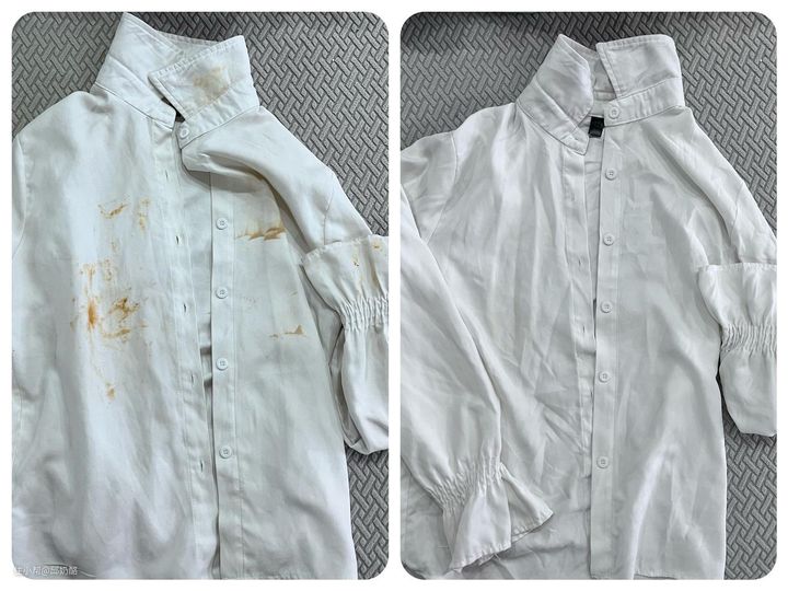 选择标准洗模式,清洗了一件满是油渍灰尘的衬衫,洗涤完成后效果明显,袖口衣领还有正面的大面积油渍都已去除干净。