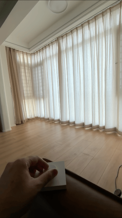 玩法六:你还可以当它是普通窗帘,走过去一拉,它就会自动打开/关闭,这点特别合适家里的老人和小孩。