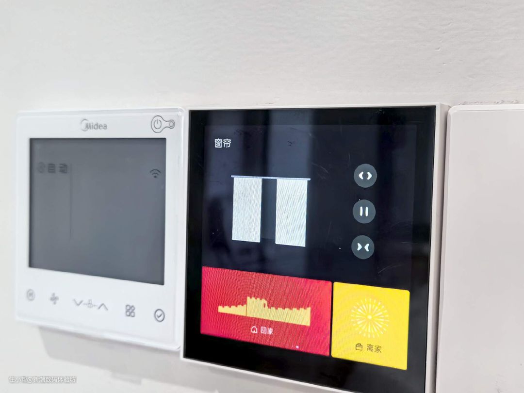 玩法二:客厅的墙上我安装了一个Aqara妙控开关E1,这是一个触屏开关,能在屏幕上直接控制全屋电动窗帘的开合,还能随时暂停。